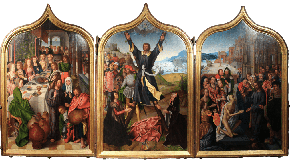 Questa importante opera d’arte, dipinta nella città fiamminga di Bruges nel 1499 – come attesta una scritta sul retro – rappresenta una delle più preziose testimonianze dei rapporti economici ed artistici tra le Fiandre e Genova. L’opera fu donata alla chiesa da Andrea della Costa, originario del paese ed emigrato a Bruges, dove a fine quattrocento sposò Agnese Adorno, figlia di una facoltosa e nobile famiglia genovese inserita nel tessuto sociale e politico delle Fiandre dell’epoca.