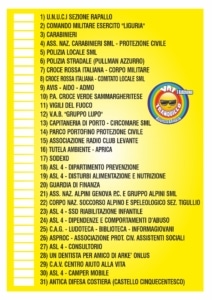 Prevista la partecipazione di U.N.U.C.I. sezione di Rapallo, Comando Militare Esercito “Liguria”, Carabinieri, Associazione Nazionale Carabinieri di Santa Margherita Ligure-Protezione Civile, Polizia Locale di Santa Margherita Ligure, Polizia Stradale (pullman azzurro), Croce Rossa Italiana-Corpo Militare, Croce Rossa Italiana-Comitato Locale di Santa Margherita Ligure, Avis-Aido-Admo, Pubblica Assistenza Croce Verde di Santa Margherita Ligure, Vigili del Fuoco, V.A.B. “Gruppo Lupo”, Capitaneria di Porto-Circomare di Santa Margherita Ligure, Parco di Portofino-Protezione Civile, Associazione Radio Club Levante, Tutela Ambiente-Aprica, Sodexo, Asl 4-Dipartimento di Prevenzione, Asl 4-Disturbi Alimentazione e Nutrizione, Guardia di Finanza, Associazione Nazionale Alpini di Genova P.C. e Gruppo Alpini di Santa Margherita Ligure, Corpo Nazionale del Soccorso Alpino e Speleologico-Sezione Tigullio, Asl 4-Ssd Riabilitazione Infantile, Asl 4-Dipendenze e Comportamenti d’Abuso, C.A.G. Ludoteca-Biblioteca-Informagiovani, Asproc-Associazione di Protezione Civile Assistenti Sociali, Asl 4-Consultorio, Un Dentista per Amico di Arké Onlus, C.A.V. Centro di Aiuto alla Vita, Asl 4-Camper Mobile, Antica Difesa Costiera (Castello Cinquecentesco).